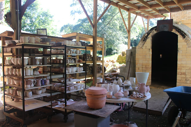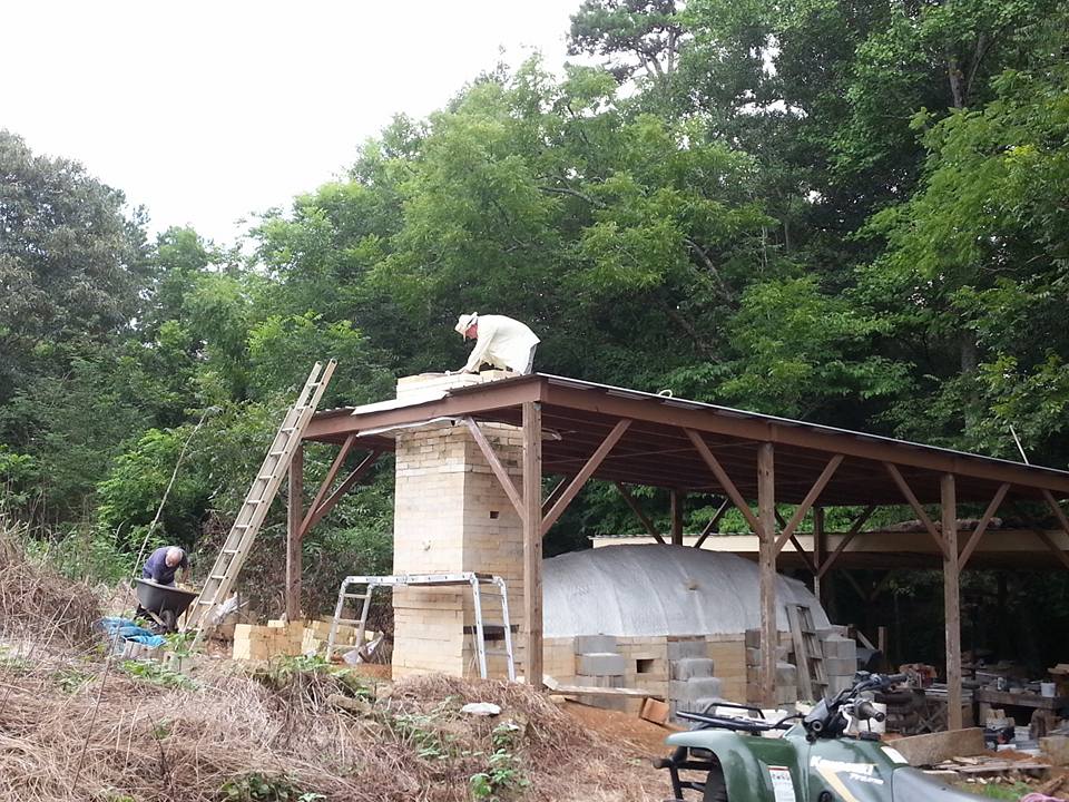 Construction of FireSong Anagama Kiln began in 2014. The entire kiln site was designed by Rob Gentry and Mike Vatalaro with longevity in mind, incorporating many subtle, but beneficial features to make firing the kiln more enjoyable and less taxing physically. This starts with the kiln pavilion. The 20′ x 60′ cement pad, provides a solid surface for tables, carts and shelves. Split wood is stored on carts, equipped with heavy duty casters, which allows them to be wheeled, with relative ease, from the wood splitting area to the staging/storage area and ultimately to the kiln for stoking. Tables are also on casters, so they can be moved around, as needed, for glazing, loading and unloading. Shelves line the edges of the pavilion, providing plenty of storage for glazes, bricks, tools, and pottery which is being readied for the firing.