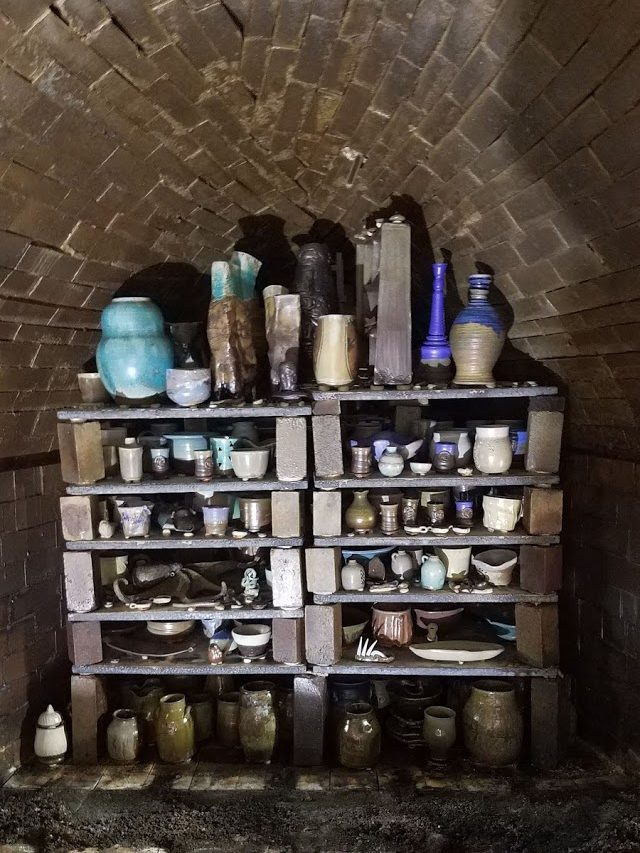 FireSong easily fits over 500 pieces of pottery in each firing (largest load to date is 639 pieces). With shelf heights from 4.5″ – 13″ and a top shelf regularly seeing pieces from 20″-36″ in height, there is plenty of space to share.